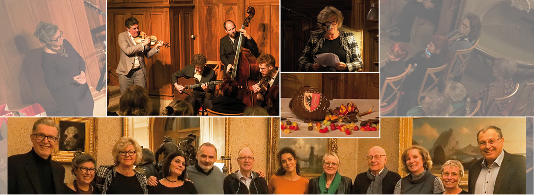 Des extraits des textes primés ont été lus par Dominique Martin, auteure. Dans le magnifique hall du château, devant un public d’environ 60 personnes, les membres du jury ont commenté chacun des textes gagnants. Ce fût une magnifique soirée, chaleureuse et musicale, dans les salons du Château Mercier. La cérémonie s’est terminée par un concert de l’ensemble The Echoes of Django, groupe musical en résidence d’artiste au Château. Pendant l’apéritif, Eva Marzi et Thierry Villon ont cassé ensemble la traditionnelle marmite en chocolat de la Fête genevoise de l’Escalade en criant la phrase rituelle: « Ainsi périssent les ennemis de la République! » pour en finir avec les ennemis.