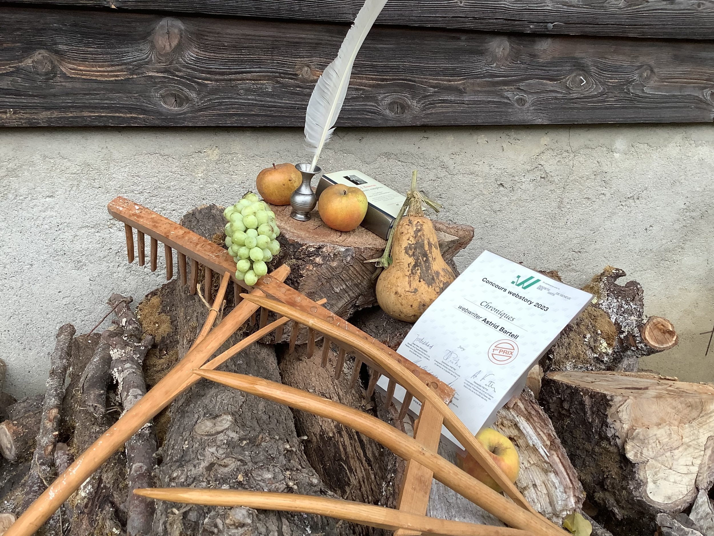 ‘D’abord, la pluie.’ Puis très peu après, la main de Michelle, ma fille Chérie, qui serre la mienne alors que les phrases défilent. Juste pour m’assurer que ben non, c’est pas un rêve. Est-ce que deux textes peuvent avoir autant de phrases en commun? Et si c’était pas le mien qui était lu avec autant de cœur que de talent? Et tout d’un coup, là-haut dans les Abeilles, le sourire de mon Père, paysan modeste malgré sa licence Grec-Latin et tout son savoir classique. Et là-haut, dans les Abeilles, les clins d’œil de ma Mère presque infirmière qui m’a transmis toute sa cuisine, toute sa couture, toute sa pâtisserie, tout son tricot. Les visages de mes Parents sont là, eux qui m’ont donné la Vie, le Respect des Livres et de leurs Auteurs, l’Amour de la Terre et de tous les délices qu’Elle sait faire pousser, tous ces fruits et ces légumes qui régalent autant qu’ils nourrissent. Et là, tout près de moi, mon équipe, trois trentenaires créateurs d’objets, mes trois Artisans favoris et mon soutien le plus indéfectible. Sur ma chaise, moi. Qui sourit, et sourit, et n’arrête pas de sourire. Et qui savoure chaque pas qui mène à la scène quand mon nom d’emprunt, le nom de jeune fille de Lina, ma grand-mère maternelle, est prononcé. Et pour brièvement revenir à ‘Chroniques’, sa source est un truc enfermé dans mon ordinateur, un texte d’une cinquantaine de pages que j’ai d’abord appelé ‘Cartes postales des 60’s’ et ‘Tartinettes’ ensuite et dont la composition va d’octobre 2019 à juillet 2022. Des tartines à la genevoise, certaines vraiment très p’tites, d’autres plus longues, une collection de vignettes que j’ai hyper compressée pour obtenir ‘Chroniques’. Toutes deux ont la magnifique Terre Nourricière de la campagne genevoise comme cadre, comme fond, comme filigrane, comme avant-plan, comme personnage principal, comme thème récurrent. Parce qu’à chaque pas, la Terre me soutient comme une Mère et qu’à chaque repas, elle m’émerveille et me nourrit comme une Mère, la Terre.