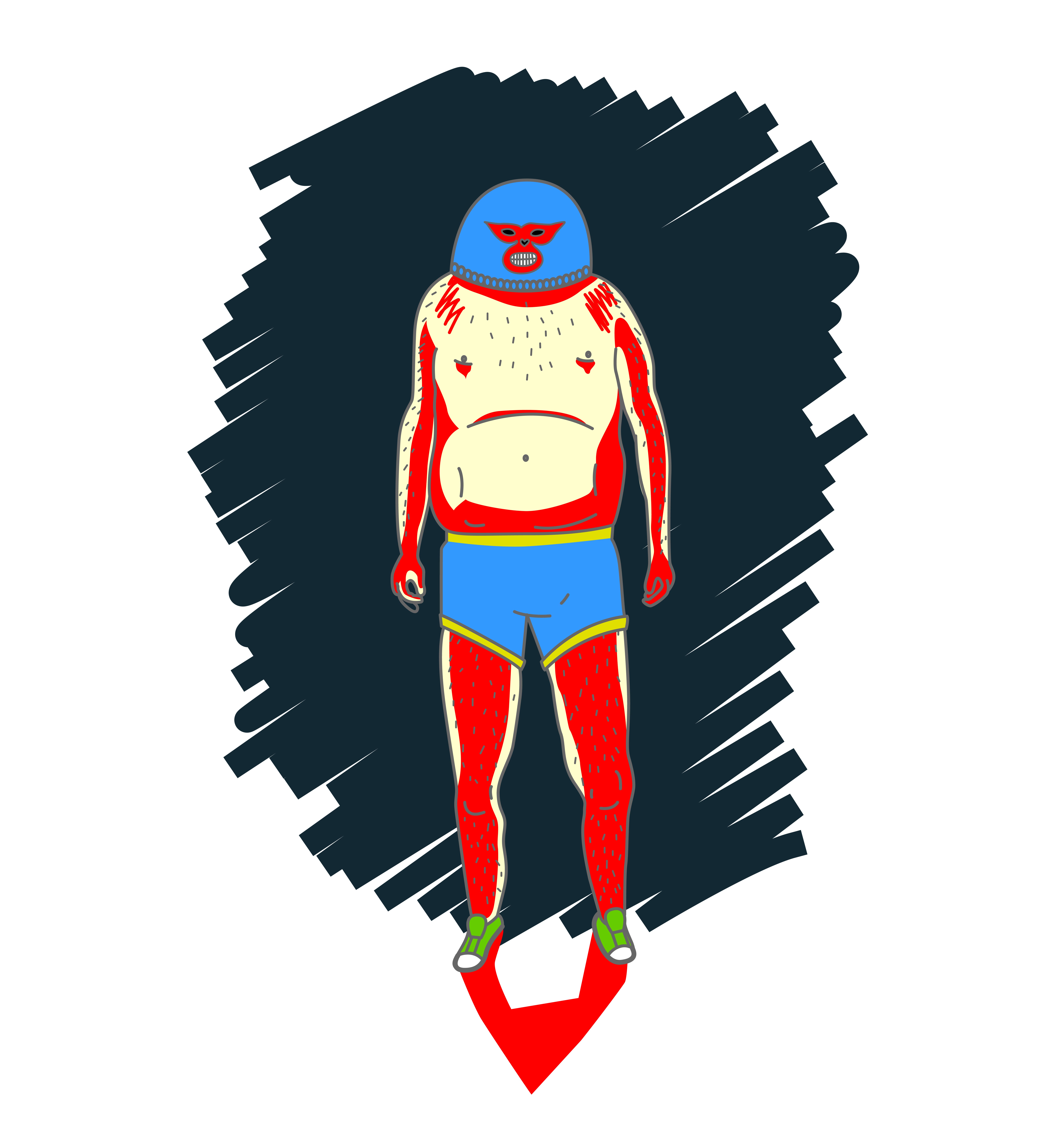 Le reste est à l’image du masque : simple, grotesque, presque cruel. Un short bleu trop moulant pour être confortable, avec un liseré sombre qui fait illusion de sérieux. Une paire de baskets vert fluo — superstition idiote. Et puis ce corps, le mien, coincé entre le cuir et la fatigue : jambes rousses, poilues mais épaisses comme deux saucissons espagnols, bras puissants, le torse large mais mou taché de rougeurs et de ridicule.